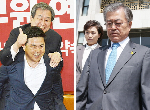 30일 오전 서울 여의도 국회 새누리당 대표실에서 열린 최고위원회의에서 김태호 최고위원이 김무성 대표를 업어주고 있다(왼쪽). 같은 날 여의도 국회 원내대표회의실에서 문재인 대표가 4.29재보선 패배와 관련해 입장을 밝히고 국회를 나가고 있다.