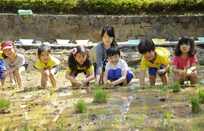 서울 광진구가 지난달 30일 오전 10시30분부터 아차산 생태공원에서 지역내 유치원생 30여명을 대상으로 '꼬마농부 모심기 체험' 행사를 진행했다. 사진은 이날 체험에 참여한 어린이들이 모를 심고 있는 모습. (사진제공=광진구청)