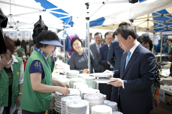 지난달 30일 중랑구청 중앙광장에서 열린 녹색나눔장터에 나진구 중랑구청장(오른쪽)이 참석해 물건들을 둘러보며 새마을부녀회원들을 격려하고 있다. (사진제공=중랑구청)