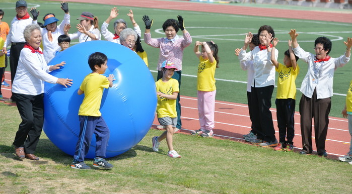 대구 달성군 논공읍 금포초등학교에서 열린 '3대(代)가 함께 행복 한마당 운동회'에서 학생들이 할머니와 함께 공을 굴리고 있다./뉴시스