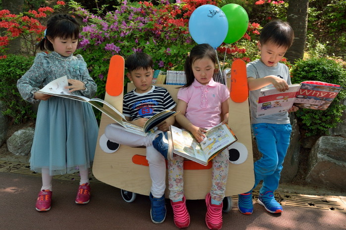 지난 5일까지 서울 송파구 수변무대 일대에서 실시된 ‘석촌호수 어린이 책잔치’에 참가한 아이들이 귀여운 캐릭터 의자에 앉아 즐겁게 책을 읽고 있다. (사진제공=송파구청)