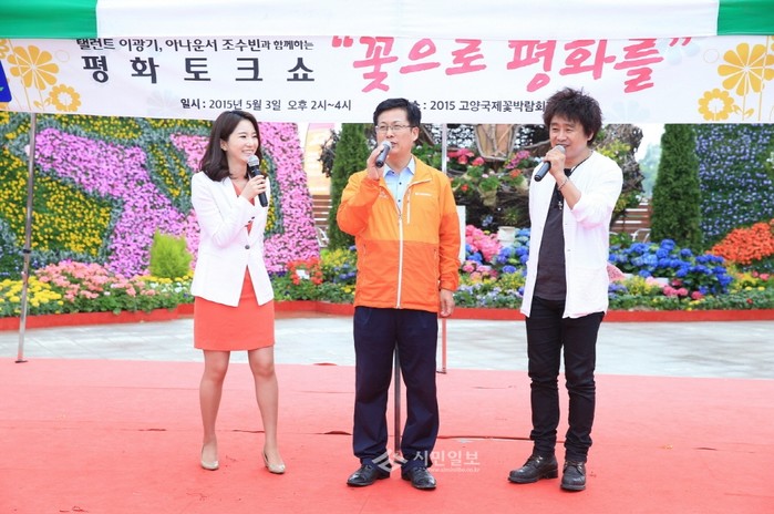 일산 호수공원에서 진행 중인 2015고양국제꽃박람회에는 지난 3일 '평화 콘서트 토크쇼'가 펼쳐졌다. 배우 이광기(오른쪽), KBS 앵커 조수빈(왼쪽)의 사회로 진행된 토크쇼는 2015고양국제꽃박람회의 주요 전시 구역을 걸으며 최성 고양시장(가운데)과 관람객들의 대화 형식으로 펼쳐졌다.