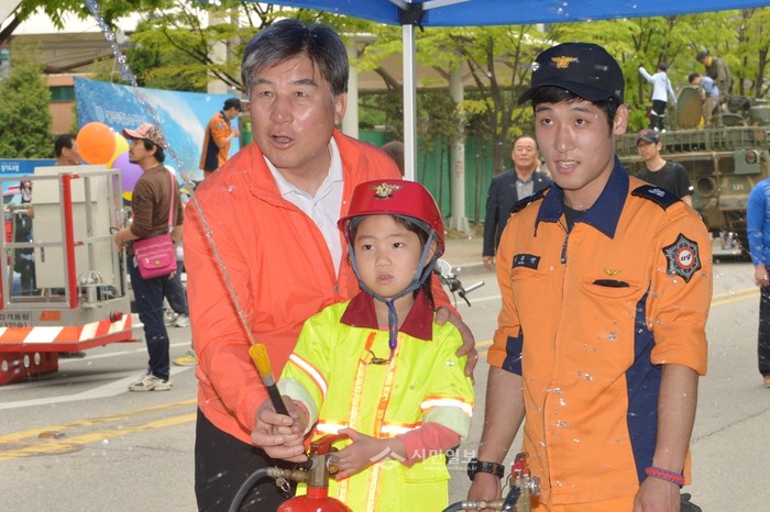 경기 동두천시가 최근 송내동 시민공원에서 어린이날 행사를 진행했다. 이날 행사에서는 다양한 공연, 소방체험, 먹거리세상 등 볼거리와 체험거리가 펼쳐졌다. 사진은 오세창 동두천시장(왼쪽)이 행사에서 어린이와 함께 물소화기 사용 체험을 하고 있는 모습.