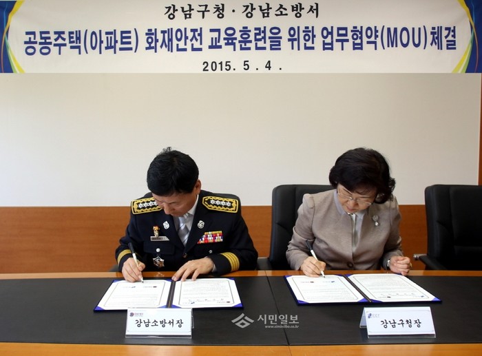 지난 4일 서울 강남구가 강남소방서와 월 1회 공동주택을 순회하며 소화기 작동법, 대피요령 등 화재 발생시 효율적인 대처방법을 교육하기 위해 실시하는 ‘공동주택 화재안전 교육훈련을 위한 업무협약’에서 신연희 구청장(오른쪽)과 박세식 강남소방서장(왼쪽)이 협약서에 사인을 하고 있다.(사진제공=강남구청)