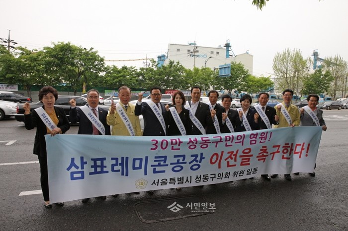 서울 성동구의회(의장 박경준) '삼표레미콘 공장 이전 촉구 특별위원회'가 최근 제217회 임시회 3차 본회의 폐회 후 삼표레미콘 공장의 이전을 조속히 촉구하는 결의문을 발표하고 결의 대회를 열어 의원들이 기념사진을 찍은 모습.(사진제공=성동구의회)
