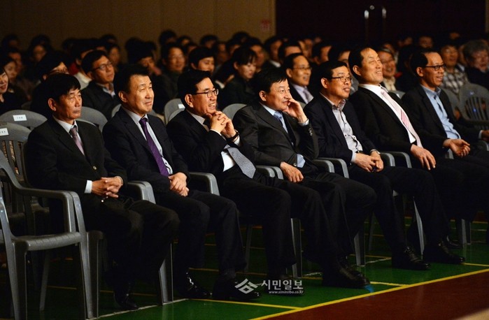 지난 6일 오후 3시 서울 동대문구청 2층 다목적강당에서 열린 '2015년 상반기 청렴교육'에서 유덕열 동대문구청장(가운데 오른쪽)과 4급 이상 간부공무원들이 청렴연극을 함께 관람하고 있다. (사진제공=동대문구청)