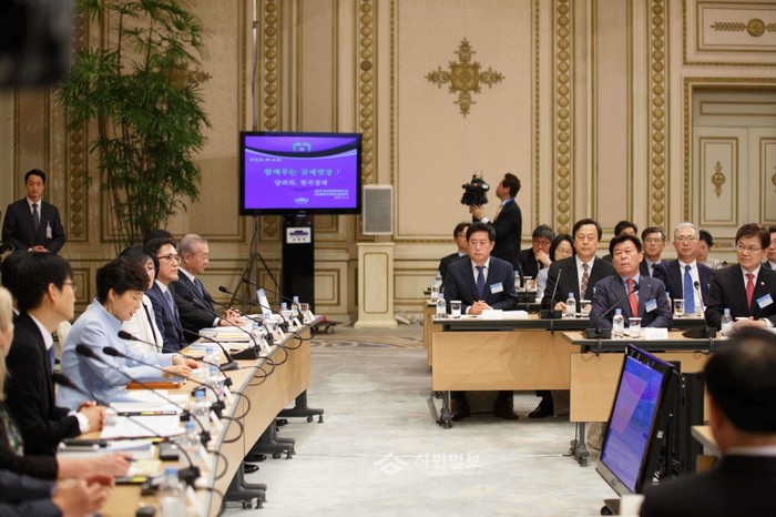 정찬민 경기 용인시장(중앙)이 지난 6일 박근혜 대통령(왼쪽 가운데) 주재로 청와대에서 열린 '제3차 규제개혁 장관회의'에 참석해 규제개선 사례를 발표했다. 사진은 이날 정 시장이 회의에 참석한 모습. (사진제공=용인시청)