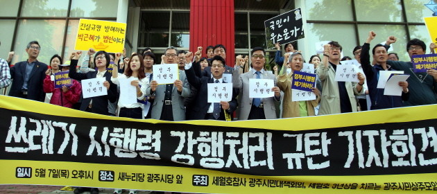 세월호 참사 광주시민 대책회의와 세월호 3년상을 치르는 광주 시민상주모임이 7일 오후 광주 북구 새누리당사 앞에서 세월호 특별법 시행령의 폐기를 촉구하는 기자회견을 열고 있다.