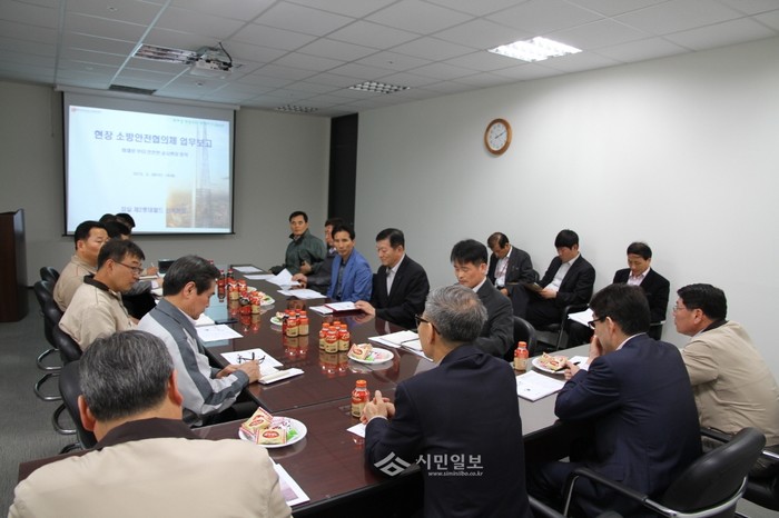 서울 송파소방서가 지난 6일 신천동에 위치한 제2롯데월드 타워동 15층 회의실에서 공사현장의 안전한 방화환경을 조상하기 위한 '안전협의체' 회의를 실시하고 있다. (사진제공=송파소방서)