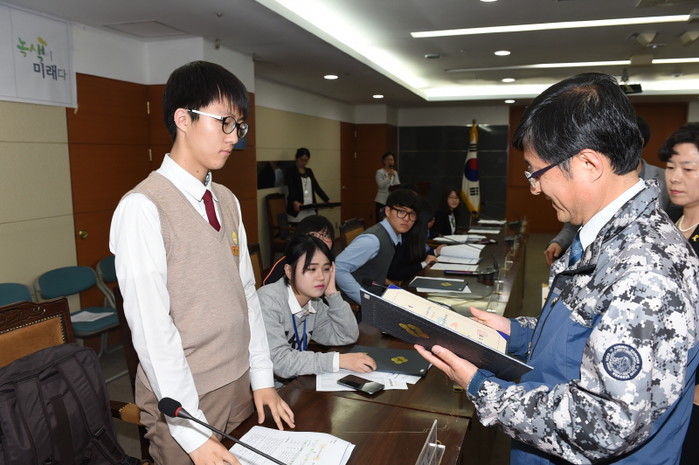 서울 노원구가 최근 구청 5층 기획상황실에서 청소년참여위원회 발대식을 개최해 김성환 노원구청장이 청소년참여위원회 위원에게 위촉장을 주고 있다. (사진제공=노원구청)