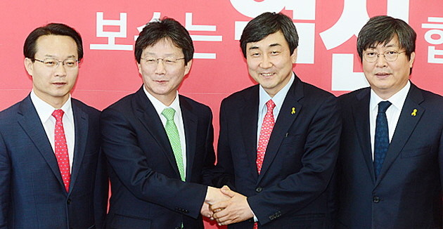 새누리당 유승민 원내대표가 10일 오후 서울 여의도 원내대표실에서 새정치민주연합 이종걸 신임 원내대표의 예방을 받고 있다.