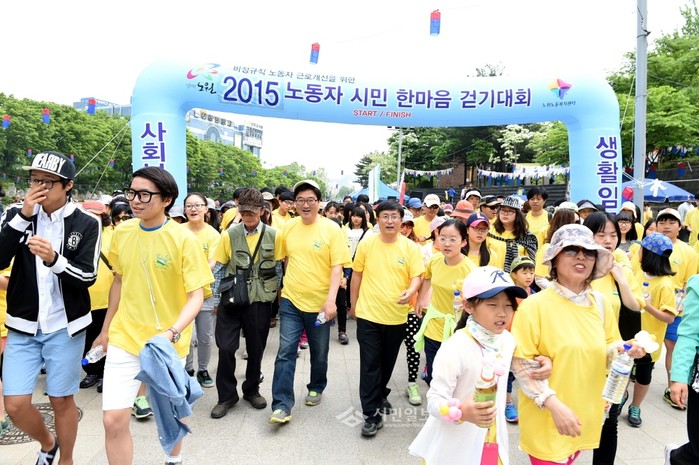 김성환 노원구청장이 지난 9일 오전 11시 노원구 중계동 어린이 교통공원 밑 당현천 무대에서 열린 '제3회 노동자 시민 한마을 중랑천걷기 대회'에서 시민들과 함께 걷기 행사에 참여하고 있다.(사진제공=노원구청)