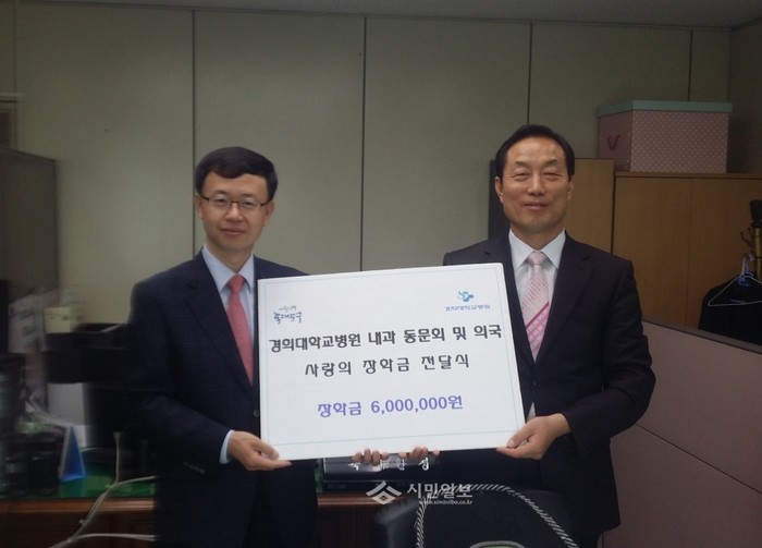 서울 동대문구청에 최근 경희대학교 류마티스내과 홍승재 교수(왼쪽)가 방문해 지역내 저소득층 학생들의 교육비로 써달라며 이원기 복지환경국장(오른쪽)에게 사랑의 성금 600만원을 전달하고 있다.(사진제공=동대문구청)