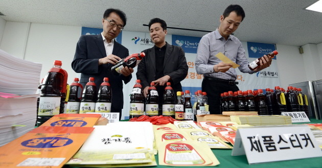 11일 오후 서울 중구 서울특별시청 남산별관에서 민생사법경찰과 수사관들이 압수한 가짜참기름과 옥수수유를 공개하고 있다.
