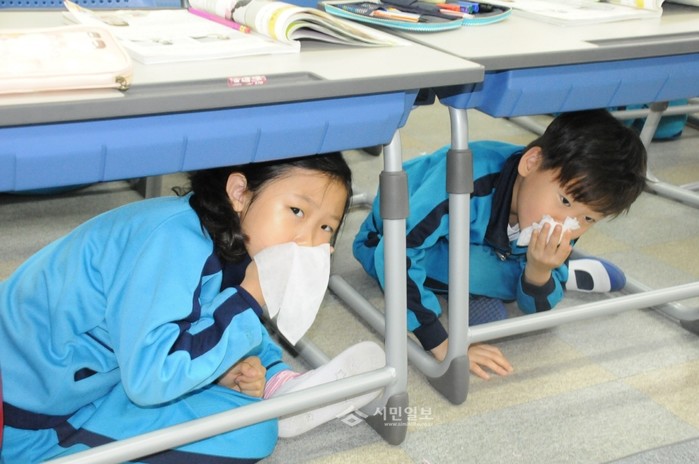 ▲ 서울 서대문소방서가 지난 12일 명지초등학교에서 학생들을 대상으로 '지진 및 화재대피훈련'을 실시해 학생들이 지진 대피훈련에 참여하고 있다. (사진제공=서대문소방서)