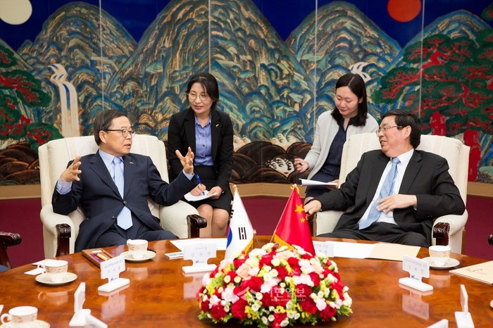 경북 구미시와 국제자매도시인 중국 호남성 창사시 위옌관칭 인민대표대회상무위원회 주임 일행이 최근 구미시를 방문해 남유진 구미시장(왼쪽)과 향후 교류협력 방안에 대해 의견을 교환하고 있다. (사진제공=구미시청)