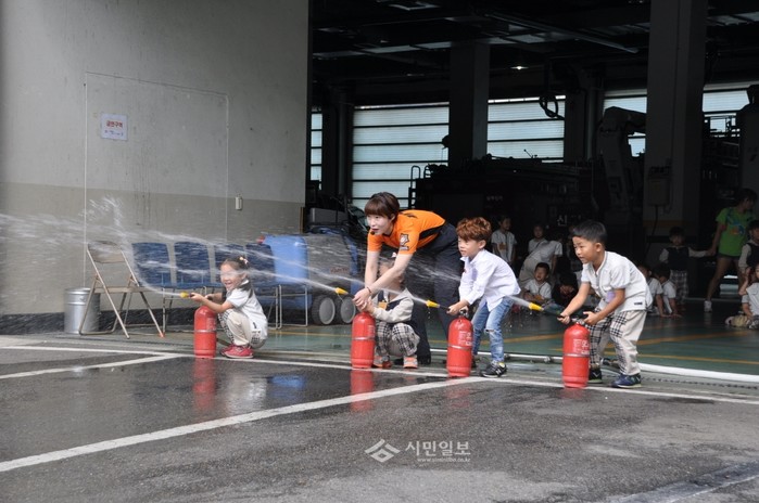 인천 남부소방서가 13일 꼬마대통령어린이집 원생과 교사를 대상으로 '119소방안전체험교실'을 운영해 참여 어린이들이 소방대원의 도움을 받아 물소화기 체험을 하고 있다.(사진제공=남부소방서)