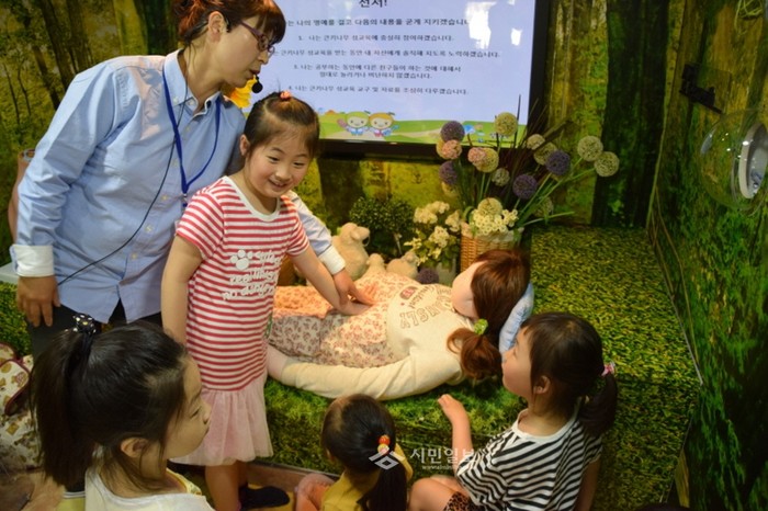 경기 연천군 백학초등학교는 최근 '큰키나무' 이동형 성교육버스를 운영했다. 사진은 참여 학생들이 숲으로 꾸며진 버스내에서 인형의 배를 만져보며 교육을 받고 있는 모습. (사진제공=연천교육지원청)