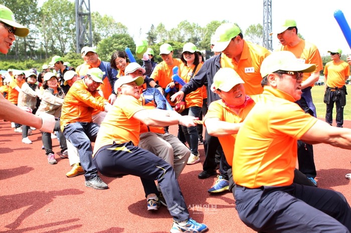 | ▲ 서울시 구의회의장협의회가 최근 잠실종합운동장 보조경기장에서 '서울특별시 구의회의원 한마음체육대회'를 개최해 뜻깊은 축제의 장을 만들었다. 사진은 의원들이 단합해 줄다리기를 하고 있는 모습.(사진제공=강동구의회) | ||