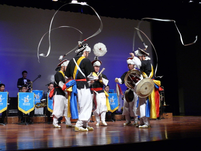 경기 양평군 군민회관에서 최근 공군작전사령부 군악대가 진행한 '군민과 화합하는 군악 공연 행사'가 열려 사물판굿팀이 무대에 올라 사물놀이를 하고 있다. (사진제공=양평군청)
