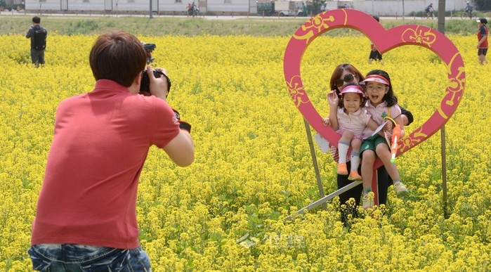 서울 서초구 서래섬에서 최근 열린 '2015 한강 서래섬 유채꽃 축제'를 찾은 시민들이 만개한 유채꽃을 배경으로 기념촬영을 하고 있다.