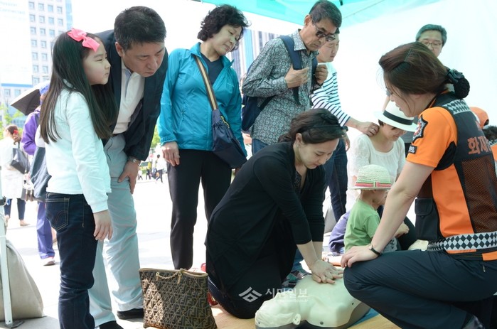 서울 영등포소방서가 지난 17일 광화문 희망나눔 장터에서 광화문 나들이 관광객을 대상으로 '119안전체험코너'를 운영해 참여자가 심폐소생술 체험을 하고 있다. (사진제공=영등포소방서)
