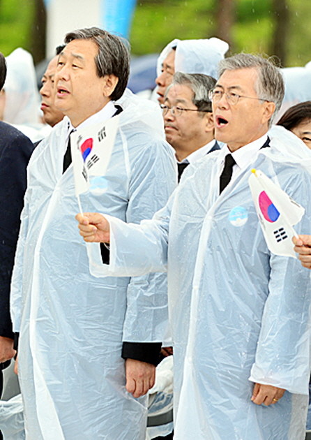 18일 오전 광주 북구 운정동 국립5.18민주묘지에서 열린 5.18민주화운동 35주년 기념식에 참석한 김무성 새누리당 대표와 문재인 새정치민주연합 대표 등이 ‘님을 위한 행진곡’을 제창하고 있다.