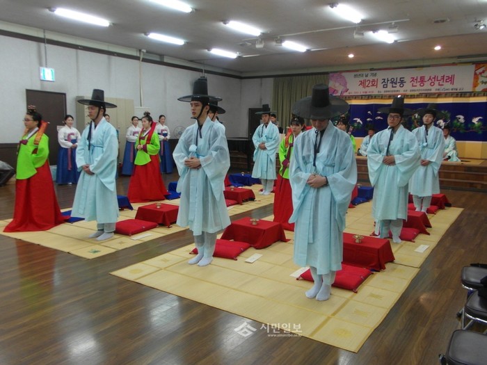 지난 18일 서초구 잠원동에서 ‘성년의 날’ 기념으로 실시된 ‘제2회 잠원동 전통성년례’ 행사에에 참가한 1996년생 13명이 절을 하기위해 옷매무새를 가다듬고 있다. (사진제공=서초구청)