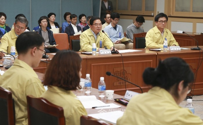 대전 대덕구가 최근 구청 중회의실에서 '2015 재난대응 안전한국훈련' 토론기반훈련을 실시해 박수범 구청장(중앙)이 훈련에 참여해 관계자들과 토론을 펼치고 있다.(사진제공=대덕구청)