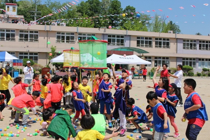 경기 연천군 백의초등학교가 최근 학교 운동장서 학생, 학부모, 주민 등과 함께 '백의 교육가족 어울마당'을 실시했다. 사진은 학생들이 바구니에 공을 집어넣기 위해 던지고 있는 모습. (사진제공=연천교육지원청)