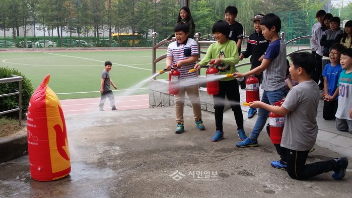 경기 부천시 부광초등학교가 최근 학생들을 대상으로 물소화기 체험 장비를 활용한 교육을 실시해 참여 학생들이 목표물을 향해 물소화기를 발사하고 있다.(사진제공=부천교육지원청)
