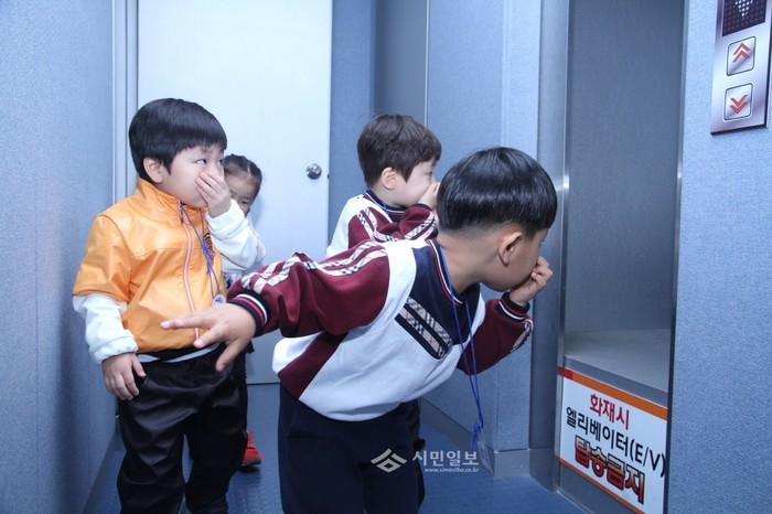 동작소방서가 최근 동작소방서 3층 소방안전체험교실에서 메이플어린이집 원아들을 대상으로 소방안전교육을 실시해 아이들이 연기를 피해 대피하고 있다. (사진제공=동작소방서)
