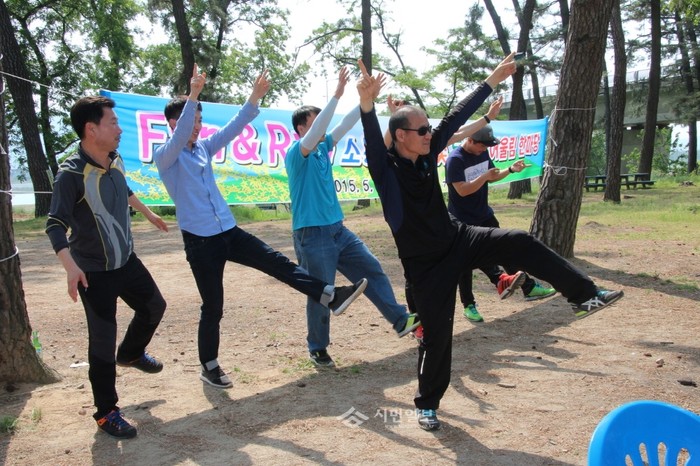 경북 구미소방서가 최근 해평청소년수련원에서 직원 220명이 참여한 가운데 직원 상호간 화합과 체력증진을 위한 'Fun&Fun 소통나들이'를 운영해 참여 직원들이 장기자랑을 하고 있다.(사진제공=구미소방서)