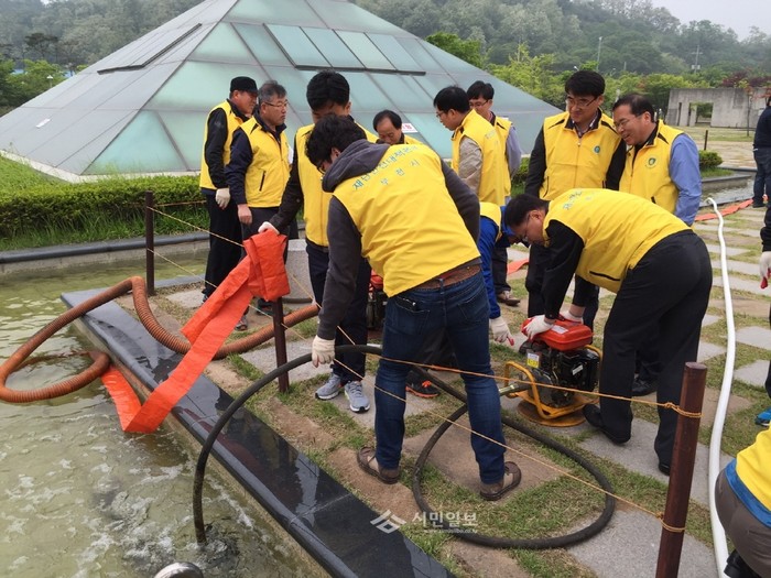 경기 부천시 소사구가 최근 '남부수자원생태공원'에서 재난업무 담당자 및 침수주택 돌봄 공무원, 소사구 자율방재단이 참석한 가운데 '여름철 재난 대비를 위한 훈련'을 실시해 참여자들이 양수기를 작동하고 있다. (사진제공=부천시청)