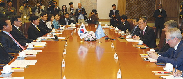 반기문 유엔 사무총장이 20일 서울 여의도 국회를 예방해 정의화 국회의장 및 여야 원내대표 등과 만나며 인사말을 하고 있다.
