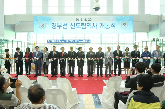 지난 20일 447억원의 예산을 투입해 지상을 통해 신도림역 남북 광장을 연결하는 철길 위 신도림역 선상역사 개통식이 열렸다. 사진은 이성 구로구청장, 박영선 국회의원, 구의원, 주민 등이 테이프 커팅식을 하고 있는 모습. (사진제공=구로구청)