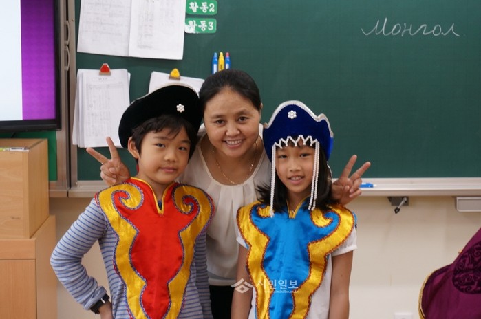 충남 아산시 용연초등학교가 최근 다문화주간을 맞이해 다문화 공감교실을 운영한 가운데 학생들이 해외 전통의상 체험을 하며 결혼이주민 강사와 함께 기념촬영하고 있다. (사진제공=아산교육지원청)