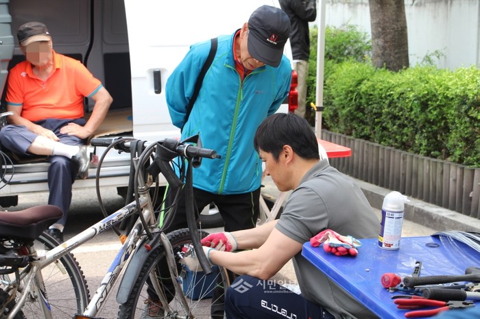 국민체육진흥공단 경륜경정사업본부 중랑지점이 최근 서울 시립중랑노인복지관을 방문해 복지관 이용 노인 80명에게 자전거 점검 및 무상수리를 실시해 한 노인이 자전거 수리를 받고 있다.(사진제공=중랑노인복지관)