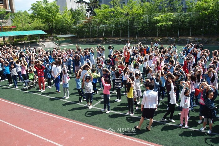 경기 부천시 중동초등학교가 지난 20일 학생과 교직원을 대상으로 '2015 재난대응 안전한국훈련'을 실시해 학생들이 운동장에 모여 기초교육을 받고 있다. (사진제공=부천교육지원청)