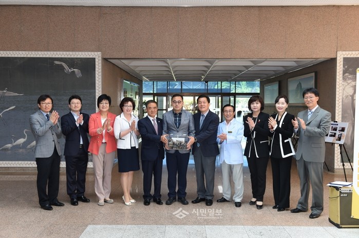 경기 수원시가 최근 시청 로비에서 저개발국가에 도움을 주기 위한 '헌 안경 기부퍼레이드 행사'를 열었다. 사진은 이날 참석한 이재준 수원 제2부시장(가운데 오른쪽), 김진우 수원시의장(가운데 왼쪽) 및 관계자들이 기념촬영하고 있는 모습. (사진제공=수원시청)