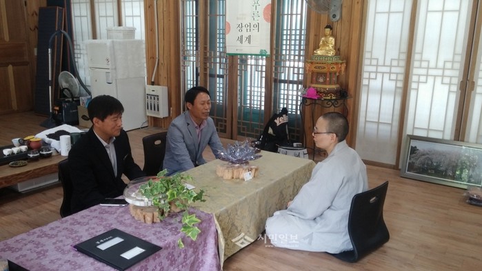 경기 김포소방서 박승주 서장(가운데)이 최근 화재예방을 위해 용화사를 방문해 관계자와 석가탄신일 전후 화재 예방에 관한 대응체계에 대해 논의하고 있다.(사진제공=김포소방서)