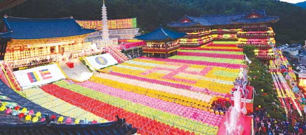 불기 2559년 부처님 오신 날을 하루 앞둔 24일 오후 부산 부산진구 삼광사 경내에 3만여 개의 연등이 환하게 불을 밝히고 있다.