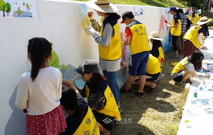 경기 평택시 자원봉사센터가 최근 비전초등학교 옆 쌈지공원 옹벽에 '행복한 마을 벽화 그리기 사업'을 진행해 비전고등학교 시각예술 동아리, 가족봉사단, 학생, 일반 시민 등이 참여해 벽화를 그리고 있다.(사진제공=평택시청)