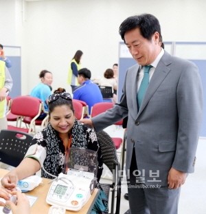 경기 용인시가 최근 분당서울대학교 공공의료사업단과 함께 다문화가족 100명을 대상으로 건강검진을 실시해 정찬민 용인시장(오른쪽)이 건강검진을 받고 있는 다문화여성에게 격려의 말을 전하고 있다.(사진제공=용인시청)