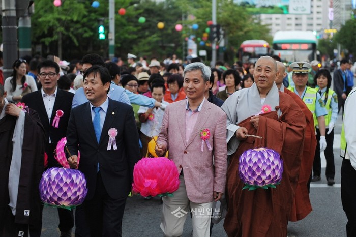경기 오산시가 지난 25일 오후 오산시청 광장에서 불기 2559주년 부처님오신날 봉축 행사를 진행해 곽상욱 시장(가운데)이 연등을 들고 재등행사에 참여하고 있다.(사진제공=오산시청)