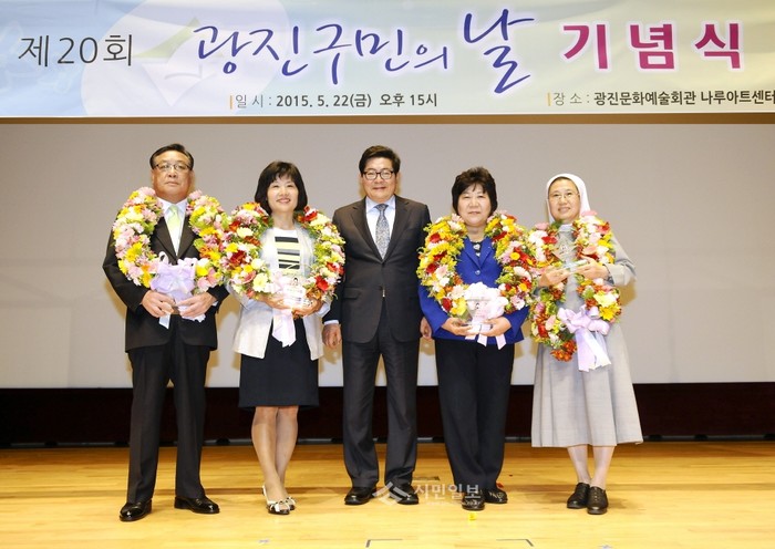 광진구가 최근 광진문화예술회관 나루아트센터에서 광진구민의 날 행사를 진행해 김기동 광진구청장(가운데)과 구민대상 수상자들이 함께 기념촬영을 하고 있다. (사진제공=광진구청)