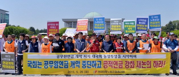 26일 오후 서울 여의도 국회 앞에서 열린 '공무원연금 개악 저지 대국회 농성투쟁 시작 기자회견'에서 한상균 민주노총 위원장이 발언하고 있다.
