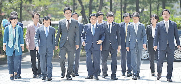 새정치민주연합 전병헌(왼쪽 네번째) 친박대책위원회 위원장을 비롯한 의원들이 ‘이완구, 홍준표 봐주기 수사 규탄 및 친박실세 6인방 엄중수사’를 촉구하며 26일 오전 서울 서초구 대검찰청을 항의 방문하고 있다.