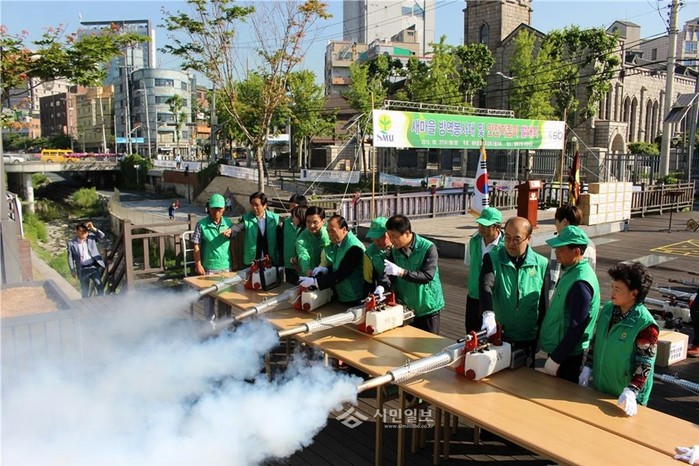 성북구가 여름철 각종 질병과 전염병 등을 예방하고자 27일 성북구청 바람마당에서 '새마을 방역봉사대 발대식'과 함께 하절기 집중 방역체제에 돌입해 참여자들이 연막기 시연을 하고 있다. (사진제공=성북구청)