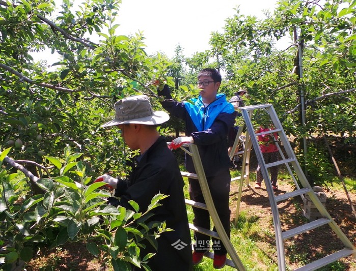 충청남도교육청 직원 70여명이 27일 예산군 오가면 일대 과수농가를 찾아 농촌일손돕기에 나서, 참여 직원들이 사과나무 적과 작업을 하고 있다.(사진제공=충남도교육청)